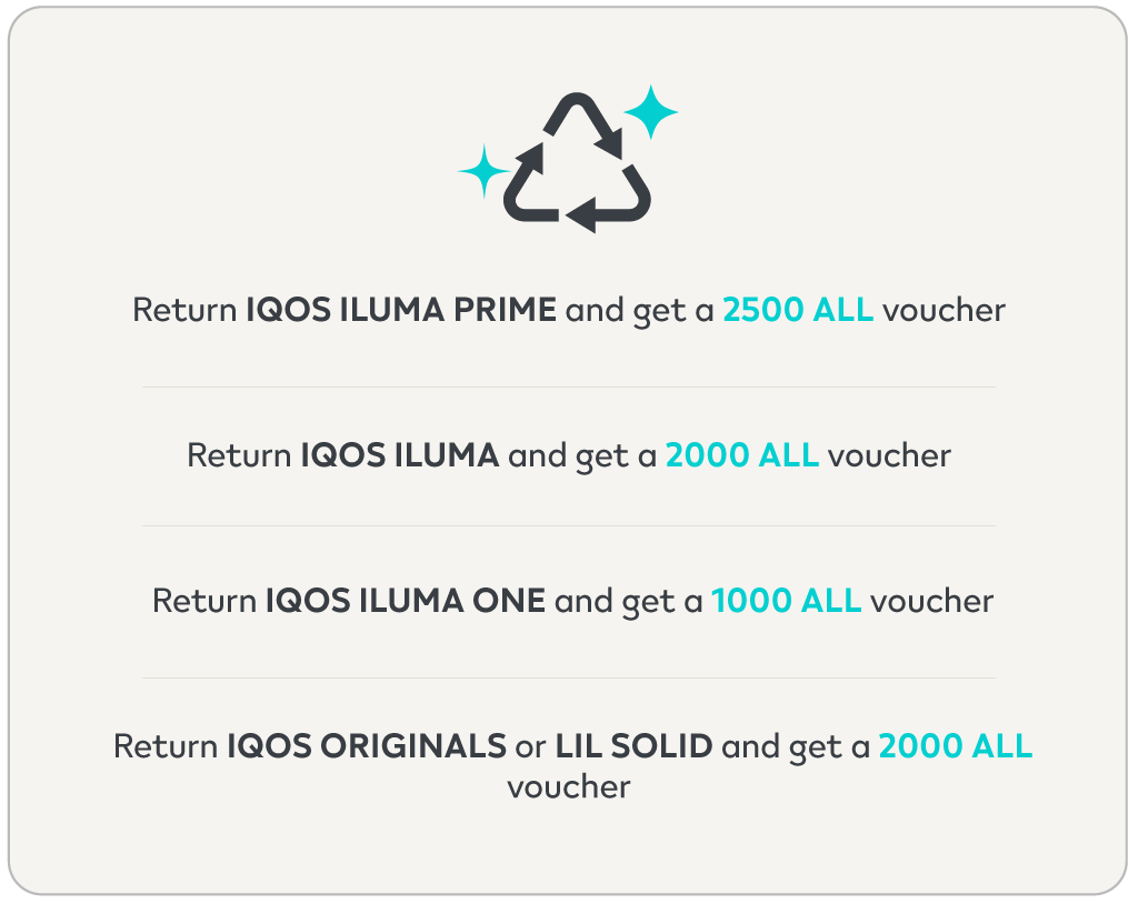 With the Green Upgrade campaign, you can bring your old IQOS device to one of our sales points and receive a voucher of varying value.