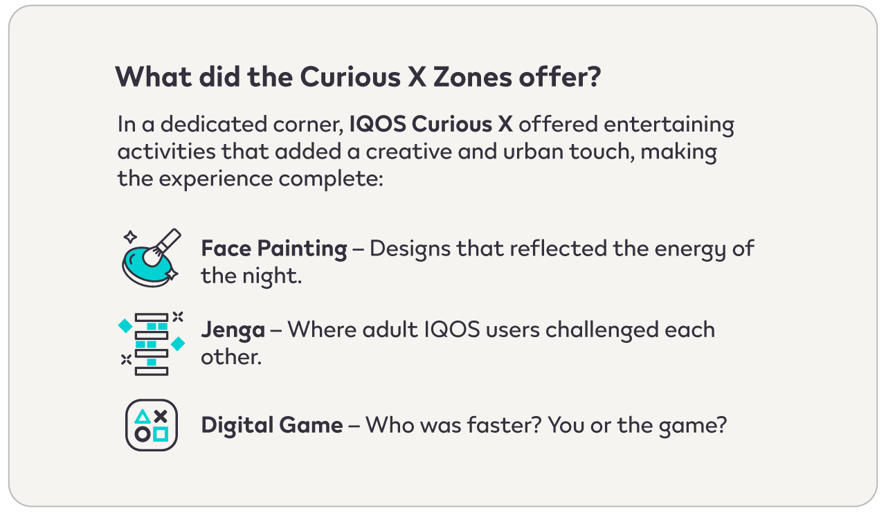 But that was not all. Neon-colored glasses, bandanas, and tote bags added style and energy to the evening. This night was only one chapter of the IQOS Curious X journey.