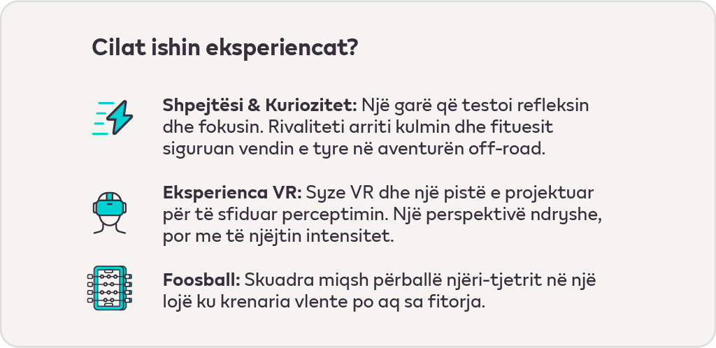 VR Experience: VR headsets and a track designed to challenge perception. A different perspective, with the same intensity.