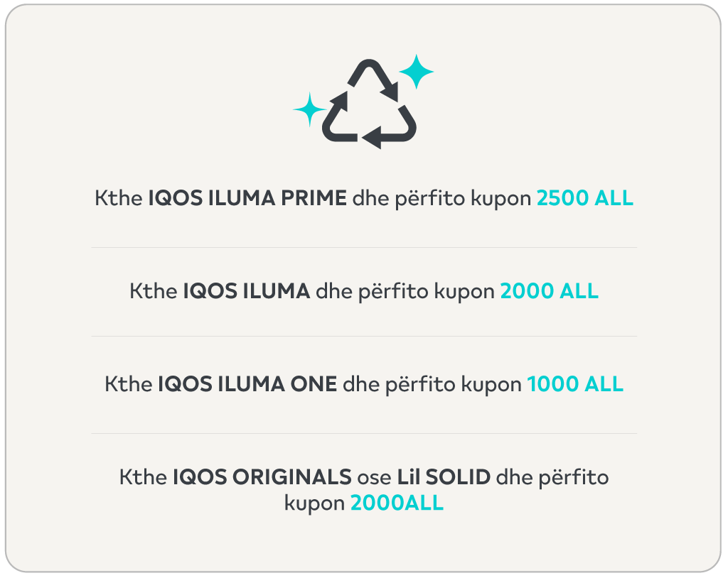 Me fushatën Green Upgrade, mund të sjellësh pajisjen tënde të vjetër IQOS në një nga pikat tona të shitjes dhe të përfitosh kupon vlerash të ndryshme.