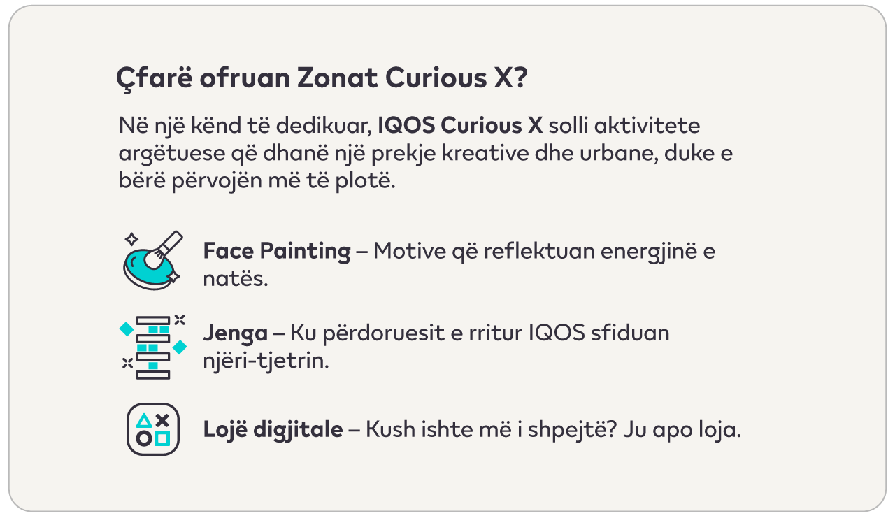 Por, ne nuk u mjaftuam me kaq. Syze në ngjyra neon, bandana dhe tote bags i dhanë stil dhe dinamizëm mbrëmjes. Kjo natë ishte vetëm një kapitull i rrugëtimit të IQOS Curious X.
